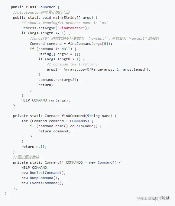 Launcher作为uiautomator进程的入口,解析参数并调用RunTestCommand的run方法