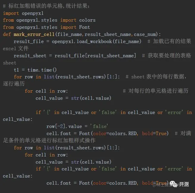 经过以上的操作,我们已经完成了批量发请求,获取结果的过程,如果我们需要对结果单元格做一些处理,比如标红加粗等操作,使测试结果中的错误信息更加明显,需要怎么操作呢?这里我们使用了python中的openpyxl库。这个库也是可以对Excel表格进行读写操作,并且可以插入一些公式和样式。我们在这里使用的是样式操作,我们根据单元格中的数据对结果进行标红加粗操作: