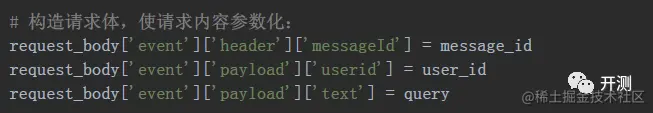 获取到了请求体模板后,我们得到了变量request_body,这是一个字典类型的数据,我们就可以对其进行参数化,以此构造我们需要的请求体了,例如我们要对每次请求的请求id、用户名、以及text的内容做修改,可以这样操作,左边是需要修改的字段,右边是我们需要的变量。