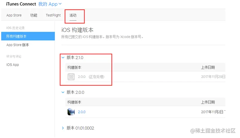 5、ipa上传成功后,进入苹果开发者中心-App Store Connect-找到该ipa对应创建的app,就可以查看到刚才上传的ipa(下图中的构建版本),注意每一次上传的ipa版本号都不能一样,如第二次上传ipa的版本号与第一次一致则无法上传通过。
