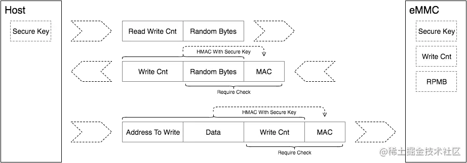 在 eMMC 内部,还有一个RPMB Write Counter。RPMB 每进行一次合法的写入操作时,Write Counter 就会自动加一 。通过 Secure Key 和 Write Counter 的应用,RMPB 可以实现数据读取和写入的 Replay Protect。
