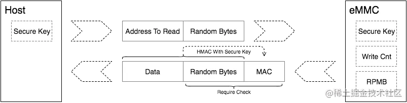RPMB(Replay Protected Memory Block重放保护内存块)Partition 是 eMMC 中的一个具有安全特性的分区。eMMC 在写入数据到 RPMB 时,会校验数据的合法性,只有指定的 Host 才能够写入,同时在读数据时,也提供了签名机制,保证 Host 读取到的数据是 RPMB 内部数据,而不是攻击者伪造的数据。