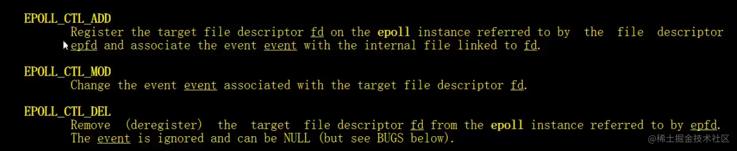 - epoll_clt 是 epoll的事件注册函数,epoll与select不同,select是传递socket描述符集合让内核循环,epoll是先将用户感兴趣的数据注册到epoll空间内,此函数式非阻塞函数,作用仅仅是增删改epoll空间内维护的描述符集合信息