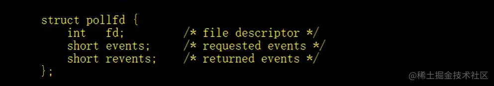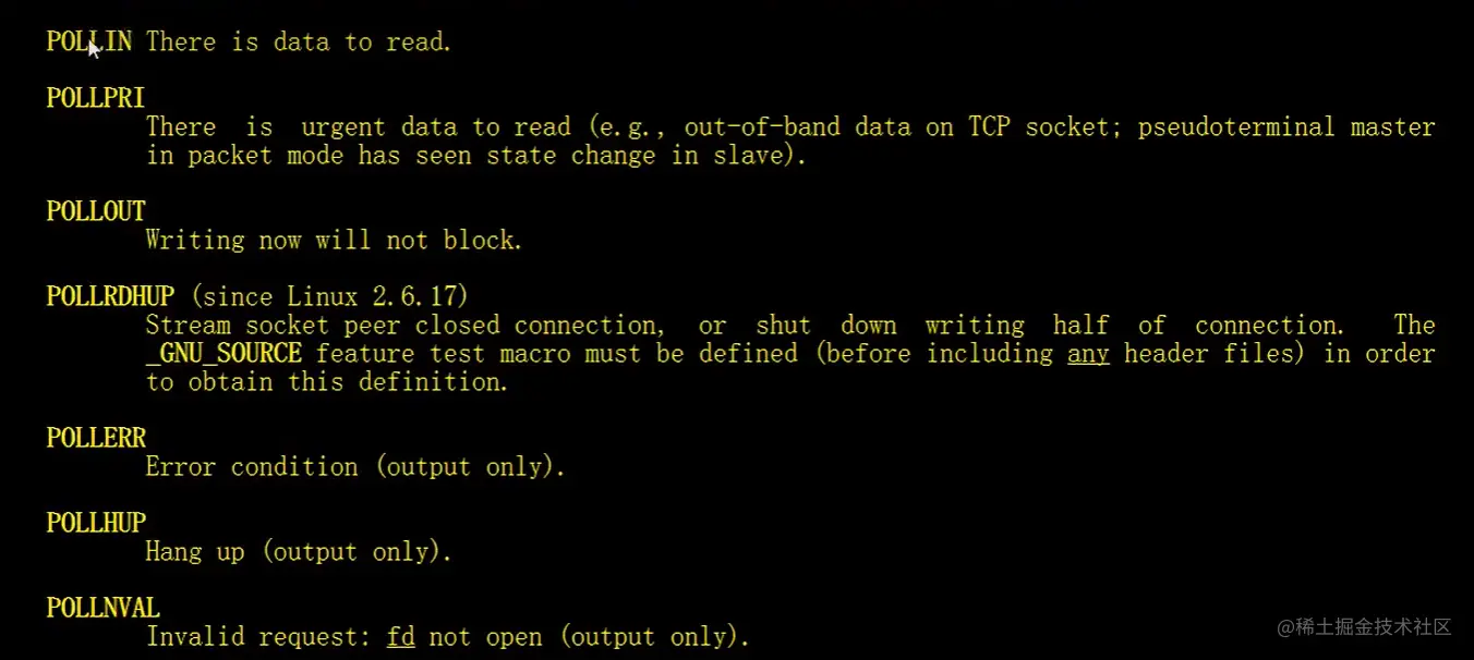 - events 为 需要监听的事件,分类如下图,我们只需要关注 POLLIN
