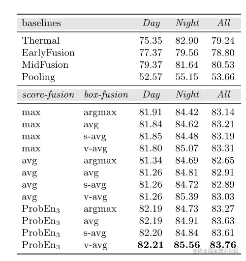 本文研究了对齐和未对齐RGB和热图像下的多模态检测的不同融合策略——非学习概率融合ProbEn。其强大性能的关键原因在于:(1)它可以利用在大规模单模态数据集上训练的高度调谐的单模态检测器,以及(2)它可以处理特定模态的缺失检测,这是融合检测时常见的情况。