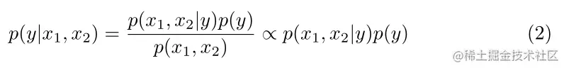 1.训练独立的单模态分类器,在给定每个单独特征模态p(y|x1)和p(y | x2)的情况下预测标签y上的分布。