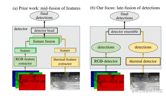 图2所示。中后期融合的高层次比较。(a)过去的工作主要集中在中融合(b)通过融合来自独立检测器的检测,用于后融合。