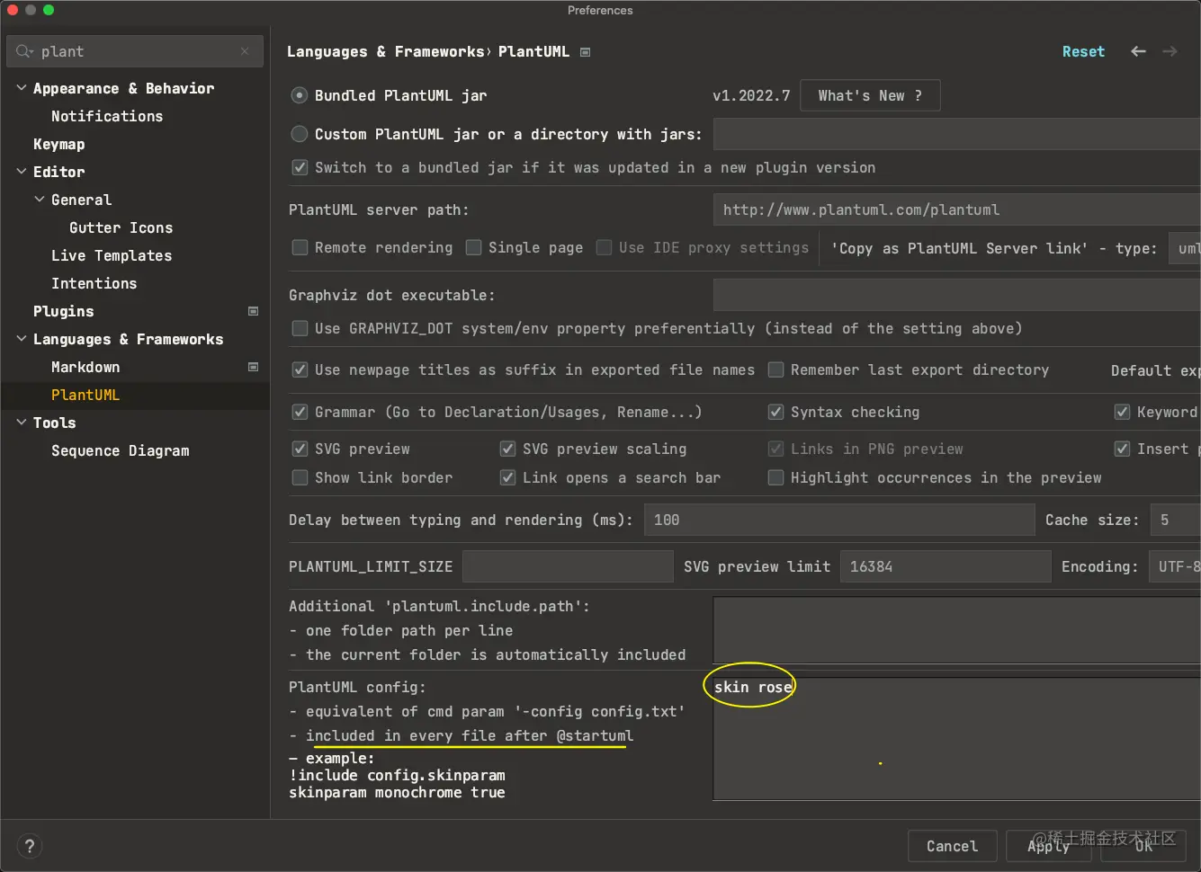 可以在 插件的设置中配置,每个 @startuml 后都自动加 skin rose 。
