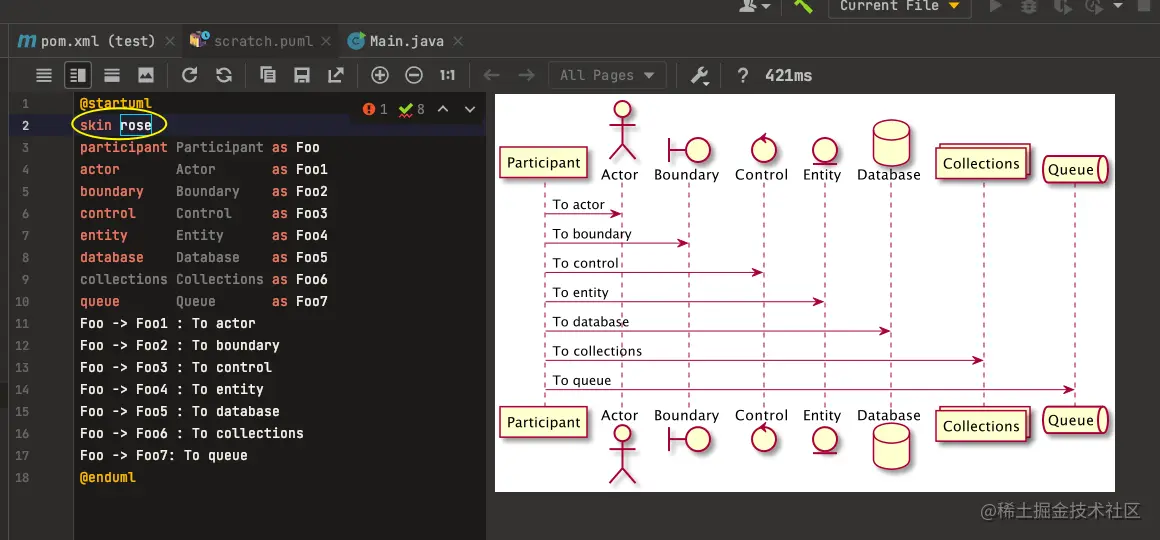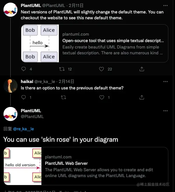 这样就不需要每个 puml 文件都加 skin rose 就可以使用老的主题了。