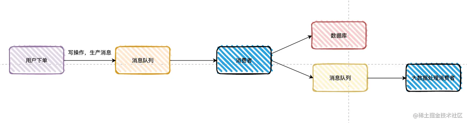 这种场景我们可以直接使用消息队列来降低下单系统和大数据系统的耦合度,下单系统可以把完整的数据发送到消息队列,大数据团队可以按需获取,这样即使大数据系统出现问题,也不会影响到下单系统,另外也可以按需获取需要的数据。