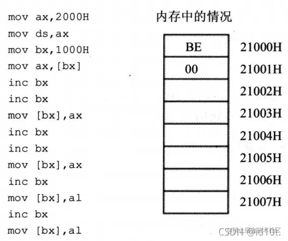 ds=2000H,bx=1000H,则mov ax,[bx]将把内存2000:1000处的字型数据送入 ax 中;