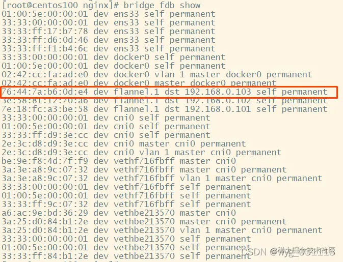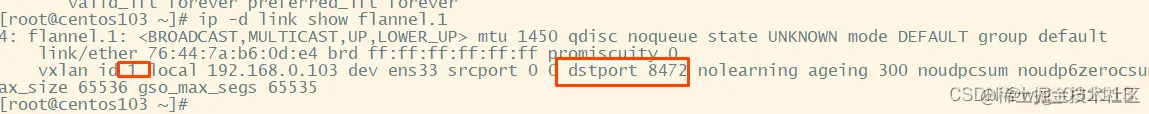 相当于一下收到两个包,一个是UDP包。然后是解析出来的MAC包。centos103上也建立了flannel.1网卡。vlan号也是1.linux内核会监听udp 8472端口。并把收到的UDP的数据包里内嵌的MAC包释放出来。这就像flannel.1网卡收到了内嵌的包。