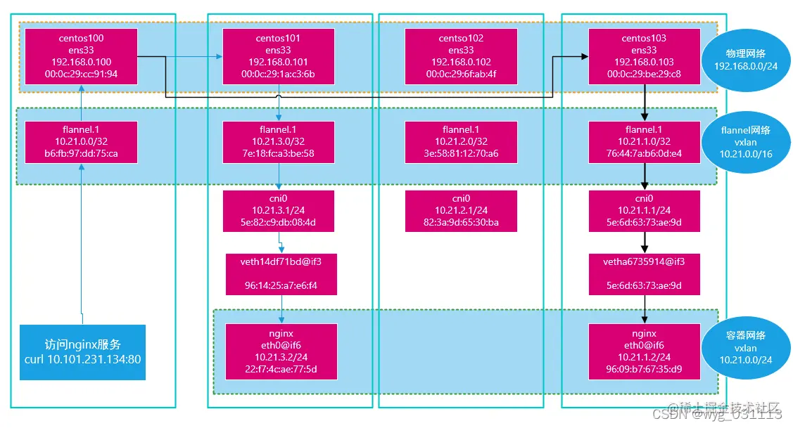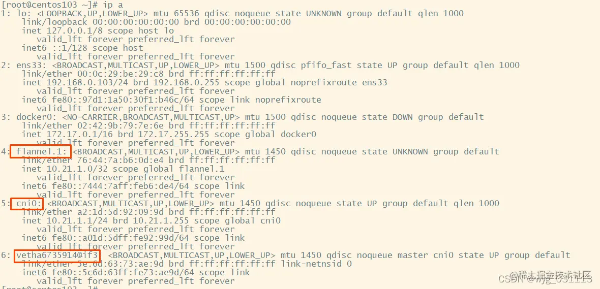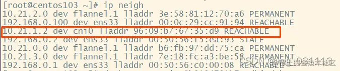 cni0, flannel.1,和ens33都处于centos103网络内。