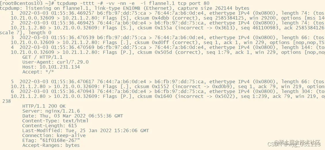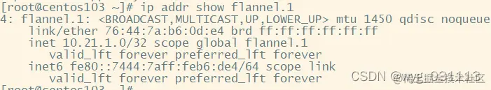 2.1 从路由表中查看,去往10.21.1.0/24的包要从flannel.1网卡发出。目标IP是10.21.1.2,而网卡flannel.1的网段也是10.21.1.0/32