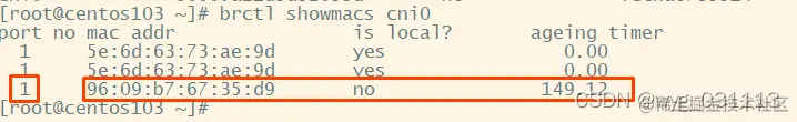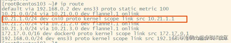 此时查看centos103上的路由 如下图,指示内核将包转发到cni0网桥。