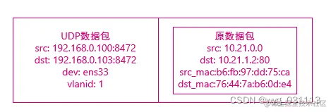 vxlan是vlan的一种,也就是说10.21.0.0和10.21.1.2在内核看来是二层连接通的。那么必须arp表和fdb表里有对应项。 arp表:ip对应目标Mac. fdd表: 目标Mac对应哪个interface发出去。