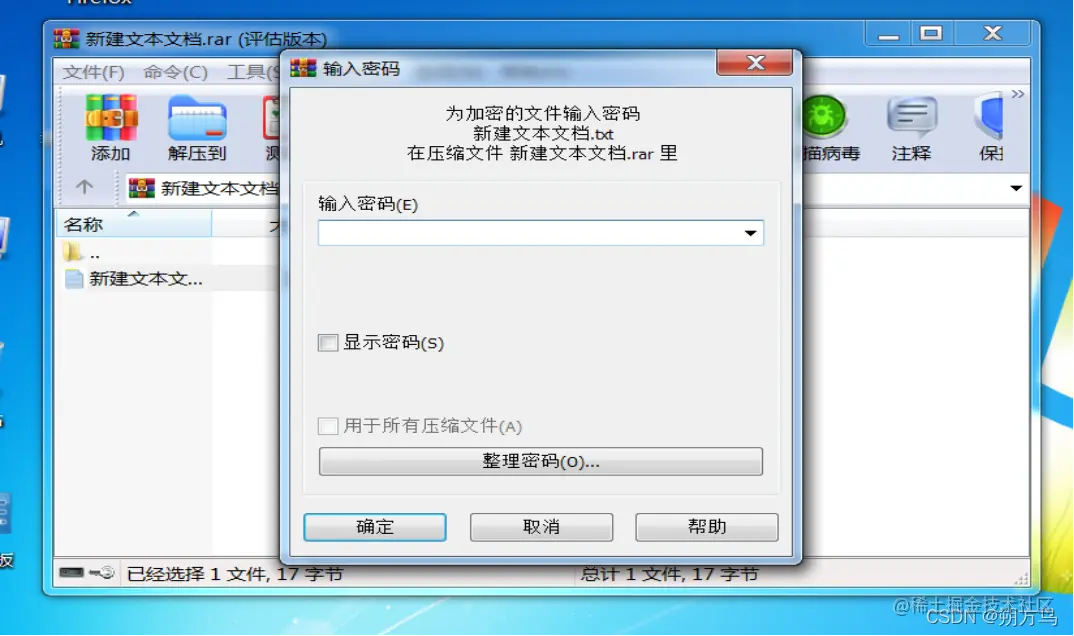 注意:该实验进行密码爆破时需根据不同的文件类型等进行爆破模式的选择,该实验选择了rar 压缩包的文件类型。此外,实验所需的字典可从网络资源上获取,或自行编辑(写个包含密码的txt文档就行,该文档在步骤五中使用)。
