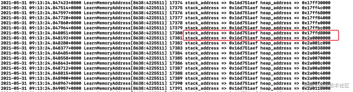 NSLog(@"%05d stack_address => 0x%lx heap_address => 0x%lx chars => 0x%lx", count, (long)&stackSize, (long)obj, (long)obj.name_buffer);