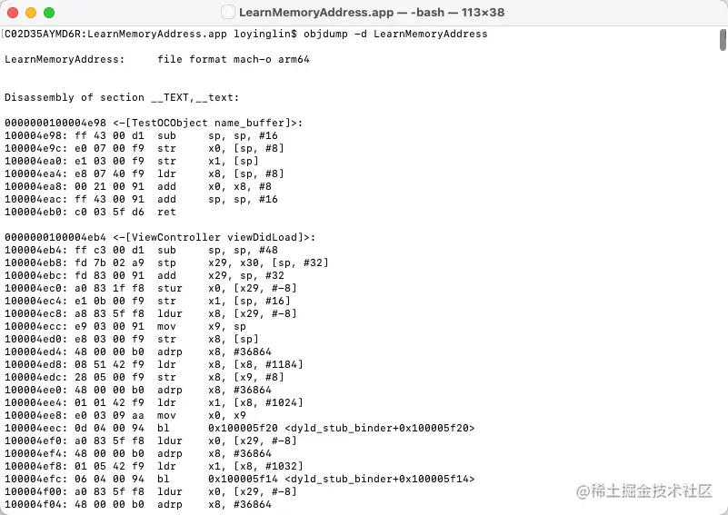 objdump指令可以得到二进制分布,比如说下面的objdump -d LearnMemoryAddress