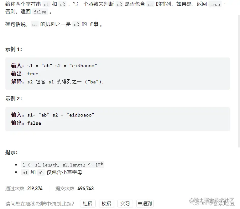 根据这一性质,记 s_1的长度为 n,我们可以遍历 s_2中的每个长度为 nn 的子串,判断子串和 s_1中每个字符的个数是否相等,若相等则说明该子串是 s_1的一个排列。