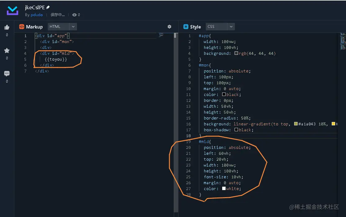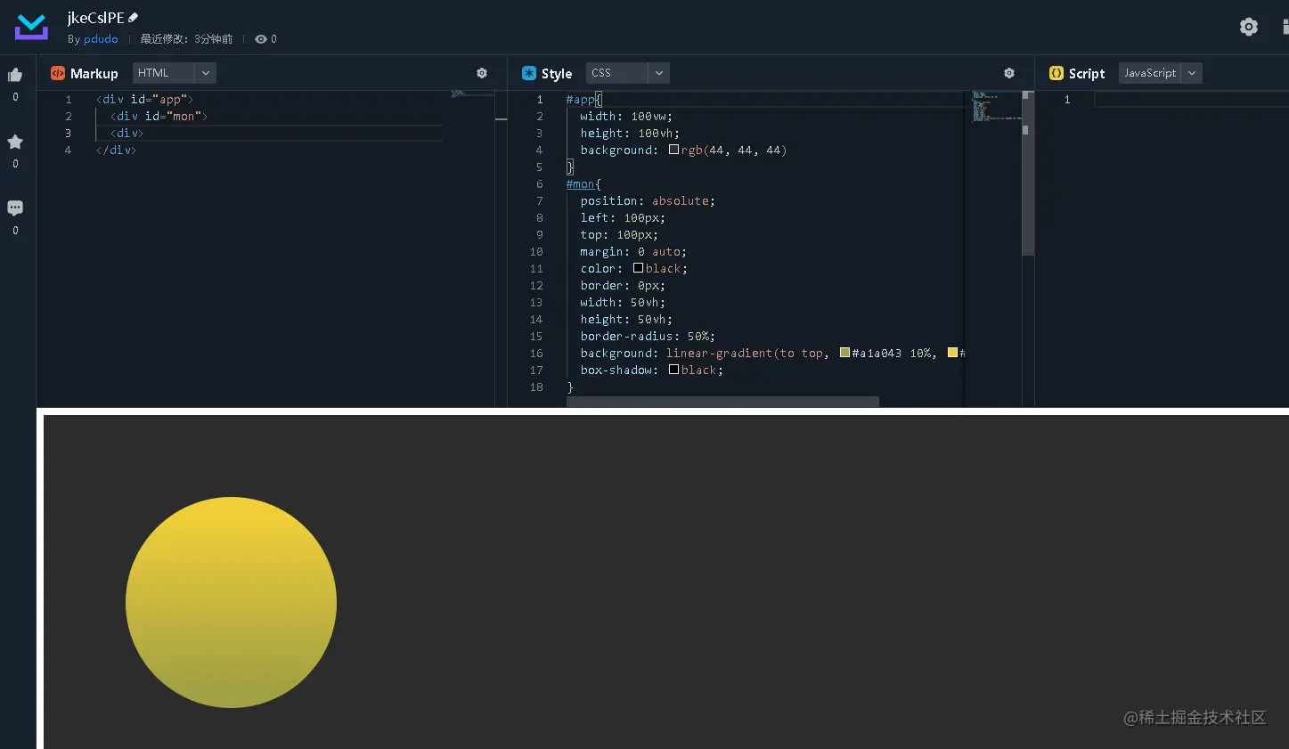 我们将整个app div标签背景颜色设置为灰色,模拟黑夜,长和宽我们都设置100vw和100vh,将这个屏幕都给渲染了,接着我们再做一个“月亮”,我们定义一个新的div给定一个id为mon,宽和高我们均设置为50vh,接着再设置一个渐变色,由灰黄色渐变亮黄色。