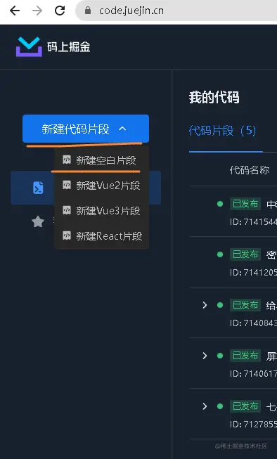 我们打开 码上掘金网站 (code.juejin.cn/) , 选择【新建代码片段】【新建空白片段】
