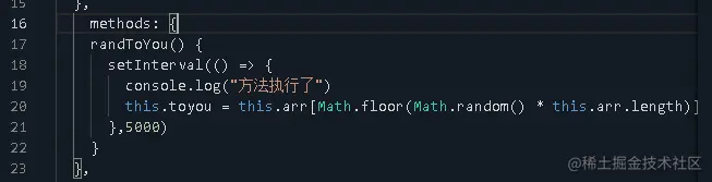 我们定义了一个arr数组,我们将需要生成的祝福语,都给写到数组中去,而后我们再定义一个方法,用于定时去改变toyou的值,代码编写如下: