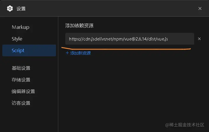 我们在依赖处,添加vue 2的cdn地址: cdn.jsdelivr.net/npm/vue@2.6…