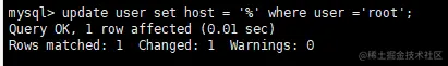 update user set host = '%' where user ='root';