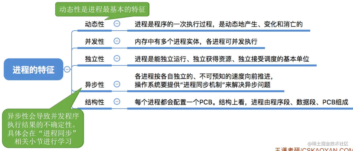 进程是由多道程序的并发执行而引出的,和程序是两个截然不同的概念。它拥有以下特征: 动态性:进程是程序的一次执行,它有着创建、活动、暂停、终止等过程,具有一定的生命周期,是动态地产生、变化和消亡的。动态性是进程最基本的特征。 并发性:指多个进程实体同时存于内存中,能在一段时间内运行。并发性是进程的重要特征,同时也是操作系统的重要特征。引入进程的目的就是是程序能与其他进程的程序并发执行,以提高资源利用率。 独立性:指进程实体是一个能独立运行、独立获得资源和独立接受调度的基本单位。凡未建立PCB的程序,都不能作为一个独立的单位参与运行。 异步性:由于进程的相互制约,使得进程具有执行的间断性,即进程按各自独立的、不可预知的速度向前推进。异步性会导致执行结果的不可再现性,所以在操作系统中必须配置相应的=进程同步机制。 结构性:每个进程都配置一个PCB对其进行描述。