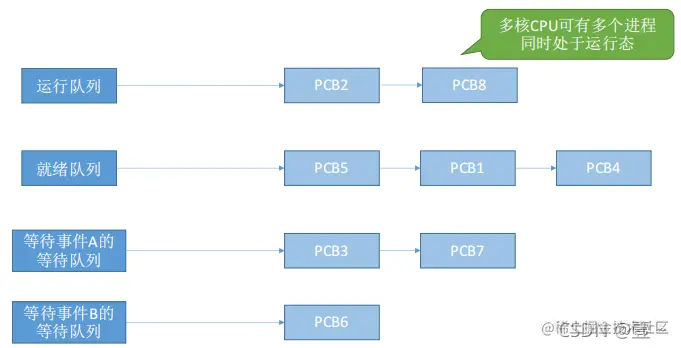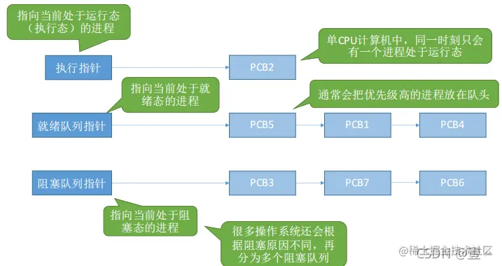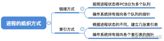 链接方式。即把具有相同状态进程的PCB分别通过PCB中的链接字链接成一个队列。