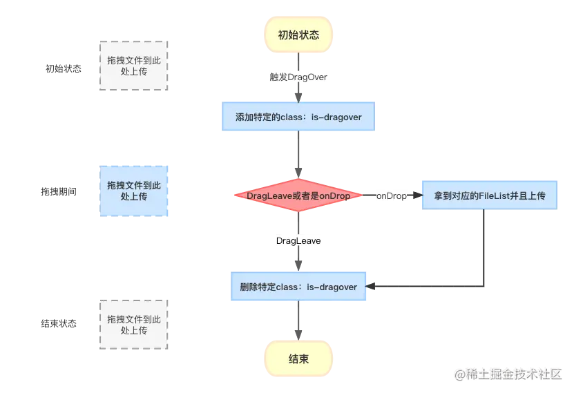 - drop事件拿到正在被拖拽的文件,删除class并且触发上传