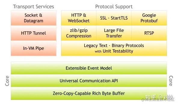 Core核心:Netty的核心,提供了底层网络通信的通用抽象和实现,包括:可扩展的事件驱动模型、通用的通信API、支持零拷贝的Buffer缓冲对象。\