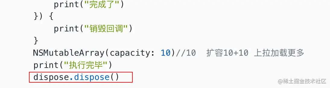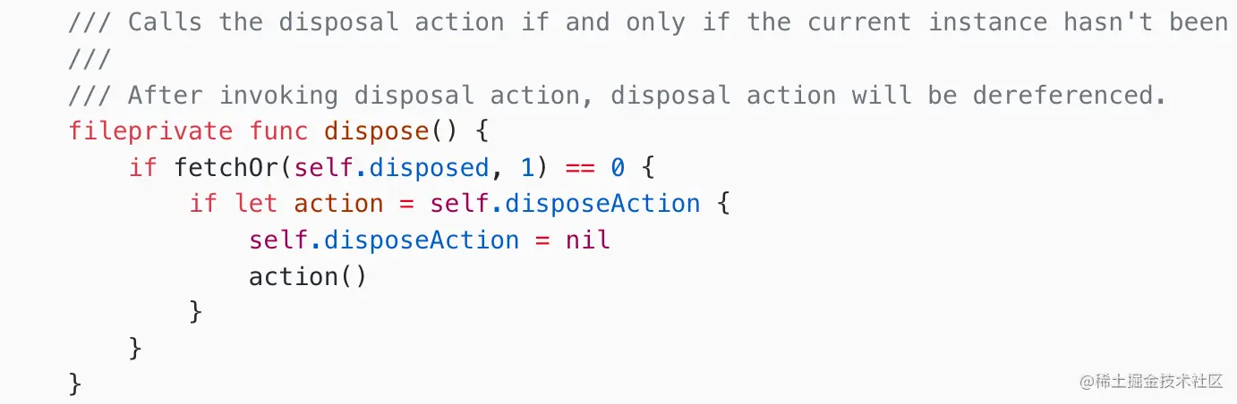 self.disposeAction = nil与 action()的执行顺序也是很重要的,因为只能发生一次销毁行为,销毁时外部的闭包只会执行一次,由于闭包执行是需要耗时的所以为了保证闭包不重复执行,先将disposeAction置空在执行
