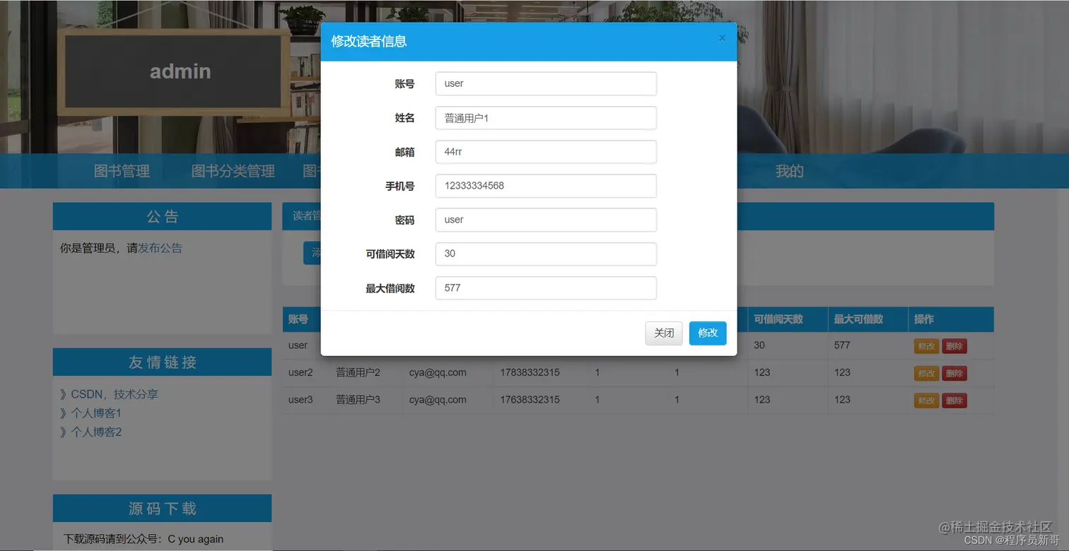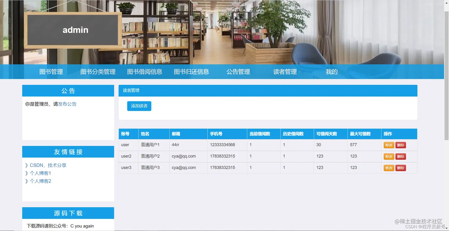 - 读者管理:根据账号、姓名查询读者基本信息,添加、修改、删除读者信息。