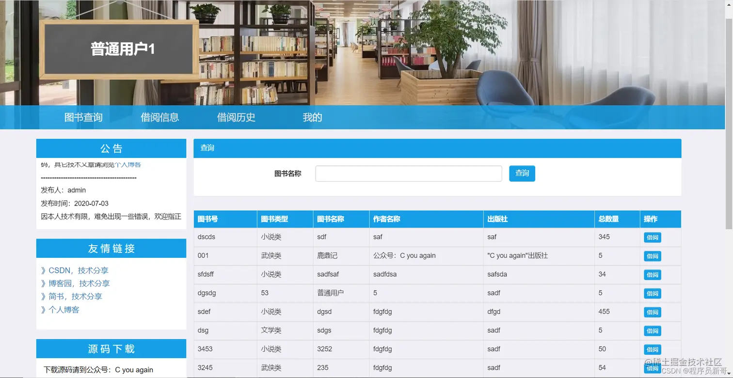 - 借阅信息:可查询图书的基本信息、借阅日期、截止还书日期、超期天数等。