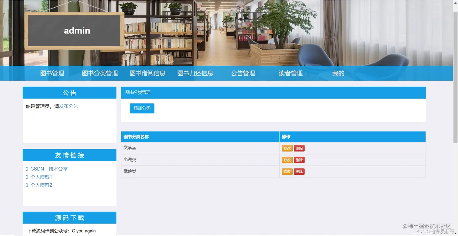 - 图书分类管理:根据分类名称查询图书分类信息,添加、修改、删除图书分类。