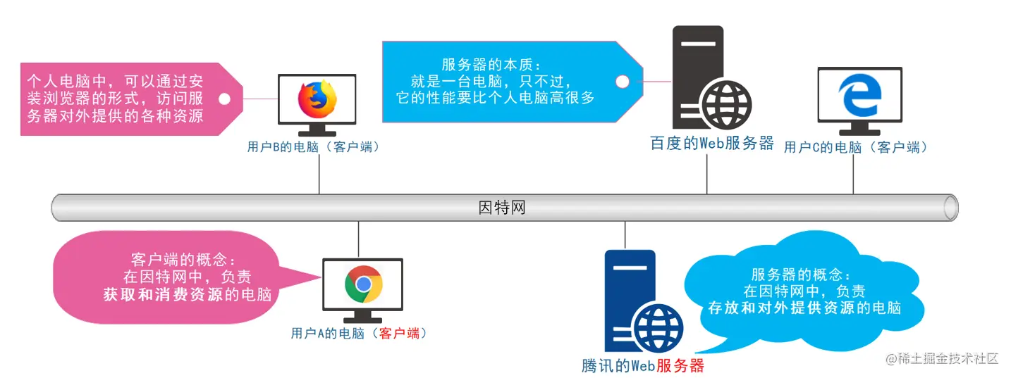 例如:根据 URL 地址,从服务器获取 HTML 文件、css 文件、js文件、图片文件、数据资源等