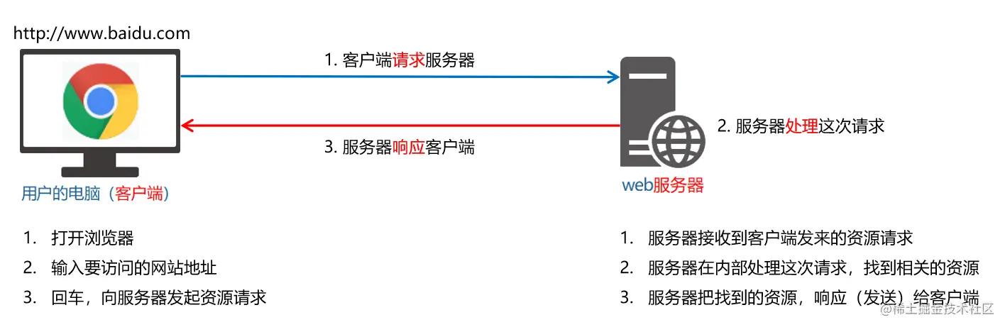 - 客户端与服务器之间的通信过程,分为 请求 – 处理 – 响应 三个步骤。