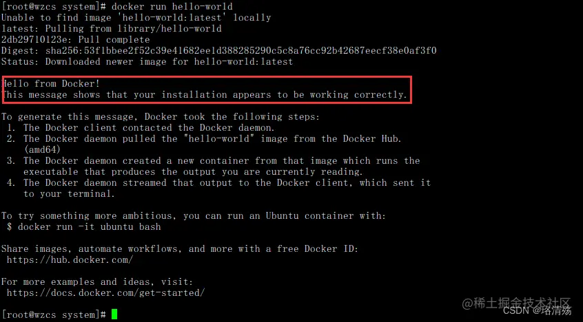 通过允许 hello-world 镜像验证 Docker 引擎是否正确安装