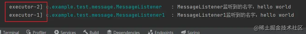 @Slf4j @Component public class MessageListener1 { @Async @EventListener(value = MessageEvent.class) public void listener(MessageEvent event){ log.info("MessageListener1监听到的名字:"+event.getName()); } }