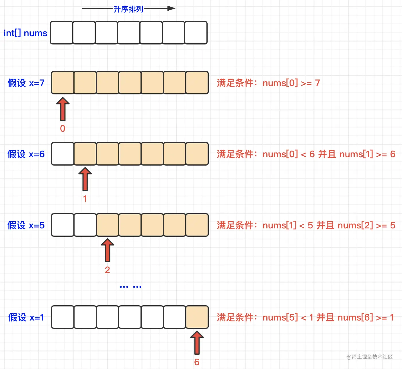 根据题目描述,x的取值范围应该是[1, nums.length],那么为了便于判断比对,我们首先需要将nums进行升序排序。然后,根据下图的例子,我们可以得出如下结论: