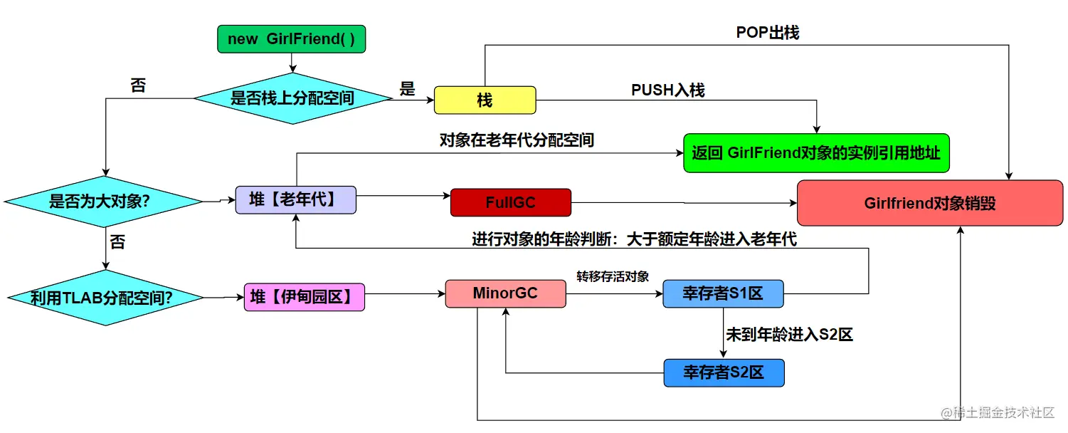 针对上述图中所包含的重要原理进行解析,通过对核心概念的解释和数据的流转彻底理解对象在内存中的存放方式以及回收流程: