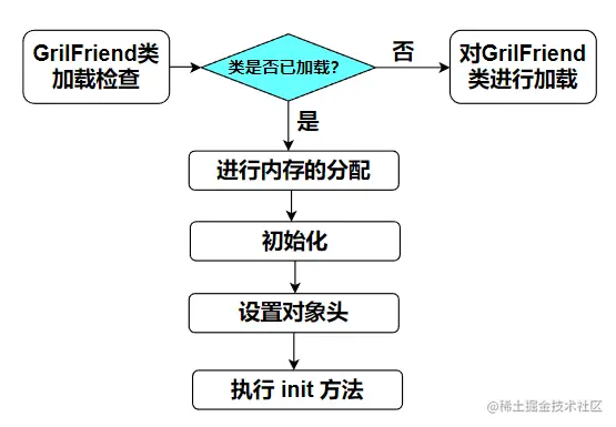 虚拟机遇到一条new指令时,**首先将去检查这个指令的参数是否能在常量池中定位到一个类的符号引用,并且检查这个符号引用代表的类是否已被加载、解析和初始化过。**如果没有,那必须先执行相应的类加载过程。new指令对应到语言层面上讲是,new关键词、对象克隆、对象序列化等。