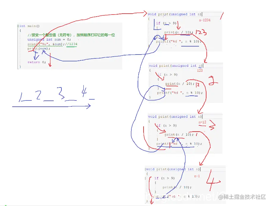 注:因为开辟空间,返回时调用函数中的变量依然会保持使用,以此实现反向输出得到想要的结果