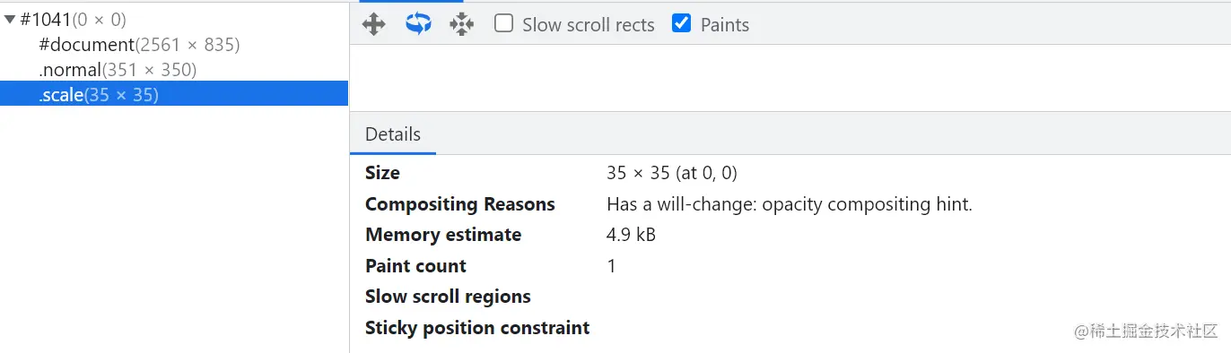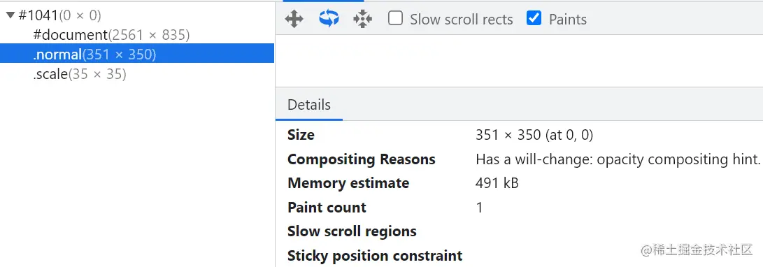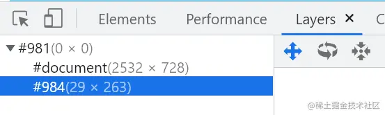 #document是每个页面默认的一个合成层,由根标签生成;#984由右侧滚动条生成(没有滚动条则没有)。右侧details栏还能看到每个层的大小、提升为合成层的原因以及在内存中占用的空间等