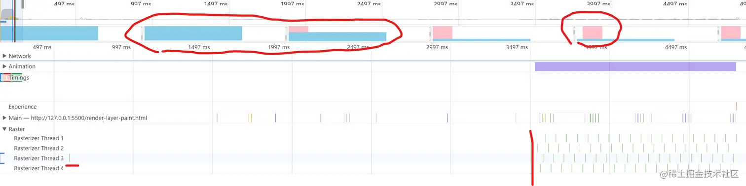 如下图所示,在首次渲染光栅化之后,滚动页面并没有触发任何光栅化线程的运行,而当页面中的内容变化(粉色块的向右位移)时,才重新触发光栅化。