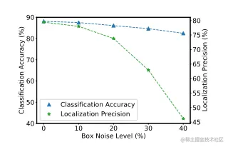 图2:Faster RCNN在模拟的“有噪”PASCAL VOC 2007数据集上的分类精度和定位精度,其中框标注被随机扰动。