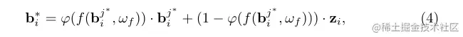 作者的目标是选择高质量的正向实例进行训练,因此φ(·)需要满足两个条件。首先,当f(bj∗i, ωf)的值较大时,应赋予bj∗i较高的权重。其次,当f(bj∗i, ωf)接近1时,φ(·)应平衡bj∗i和zi的权重,而不是依赖于bj∗i。为满足上述条件,采用如下有界指数函数: