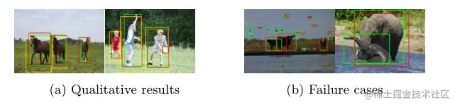 图6:(a) OA-MIL FasterRCNN(红色方框)和vanilla FasterRCNN(黄色方框)在COCO数据集上的定性结果。(b)故障案例。